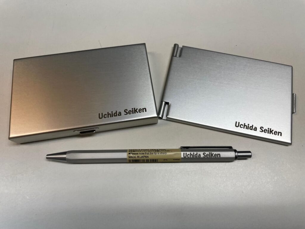 今年もインターンシップは、レーザーマーキングの体験を実施しています。マーキング用のアイテムは、名刺ケース、折りたたみミラー・ボールペンの中から1点を選んでもらいます。