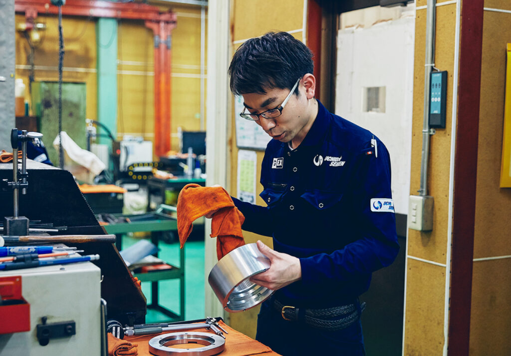 大学時代は、モノづくりとはまったく関係のない心理学を専攻。新卒では人材派遣会社に就職し、管理側の立場で仕事をしていました。入社から数年が経ったころ、研修の一環で自分自身が工場での仕事を経験する機会があり、そこで手を動かしてものをつくる面白さと出会ったことで転職を考えるようになっていきました。さらに、当時の彼女(現在の妻)が川口市に住んでいたため、この周辺の製造業に絞って会社を探すことに。いくつかの会社を訪ね、実際に現場も見学させてもらうなかで、内田精研の明るい現場の雰囲気に最も惹かれたのです。社員の方々の挨拶がすごく印象的で、「ここだったら、楽しく働けそうだ」と感じられたことが大きかったですね。ちなみに、そのとき感じた明るい印象は入社してからも変わりません。また、研磨や研削に関しては何の知識もありませんでしたが、不安より「早くモノづくりの仕事がしたい」という期待の方が大きかったことを覚えています。